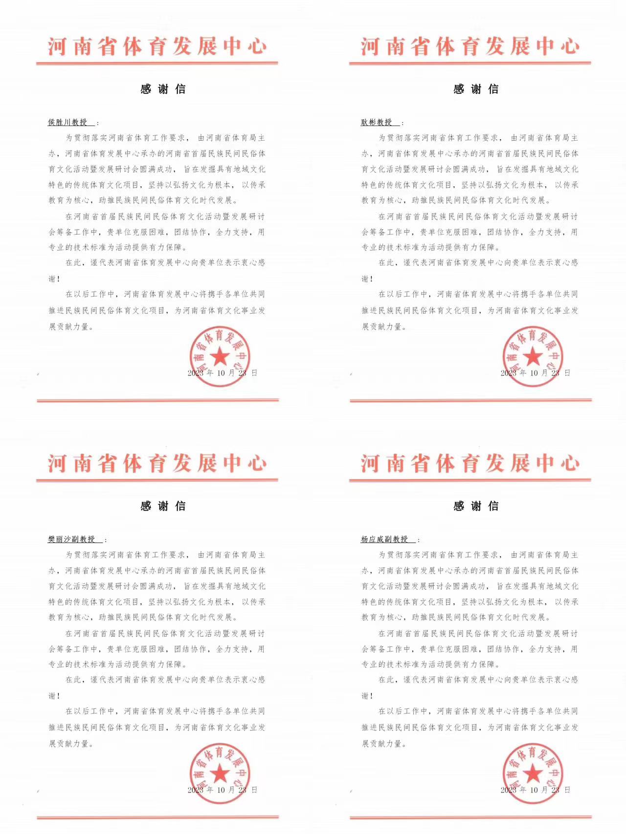 近日,我系收到来自河南省体育发展中心的感谢信,信中对我系为河南省首届民族民间民俗体育文化活动暨发展研讨会的筹备工作以及我系侯胜川、耿彬、杨应威、樊丽沙四位老师的付出表示感谢。