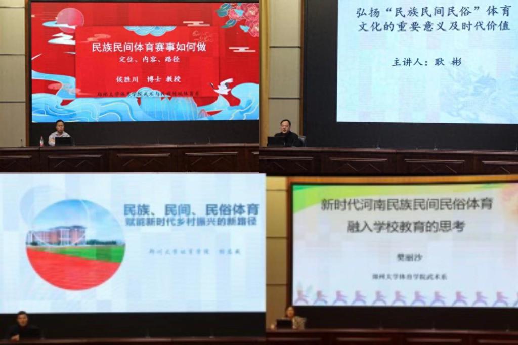 研讨会上,我系侯胜川、耿彬、杨应威、樊丽沙四位老师围绕弘扬“民族民间民俗”体育文化的重要意义及时代价值、新时代河南民族民间民俗体育融入学校教育的思考、民族民间民俗体育赋能新时代乡村振兴新路径以及民族民间体育赛事如何做--定位、内容与路径等主题进行了专题报告,共寻、共商、共谋民族民间民俗体育文化的渊源之根、传承之策、振兴之路,为民族民间民俗体育的高质量发展献计献策。