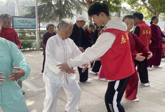 最后,在学生志愿者认真细致的示范过程中,老人们开始逐渐领会每个动作的要领。学生志愿者们以标准规范的动作、清晰明了的节奏,为老人们展示了八段锦的魅力。他们耐心地重复着每一个动作,从起始姿势到结束动作,都毫无保留地呈现给老人们。在志愿者们的积极引导和帮助下,老人们认真地模仿学习,慢慢熟悉了每个动作的步骤和关键要点,逐渐在练习中掌握了八段锦的动作要领。