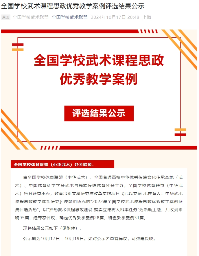 近日,全国学校武术课程思政教学案例评选活动圆满落幕,我系教师在本次评选中表现出色,共获得六项教学案例奖项。