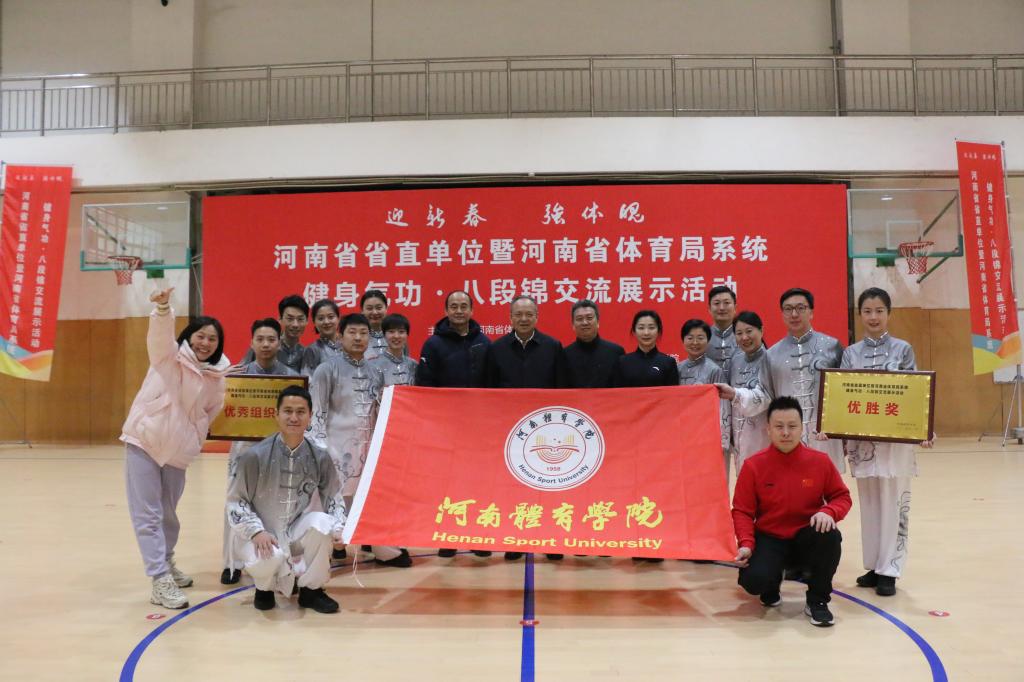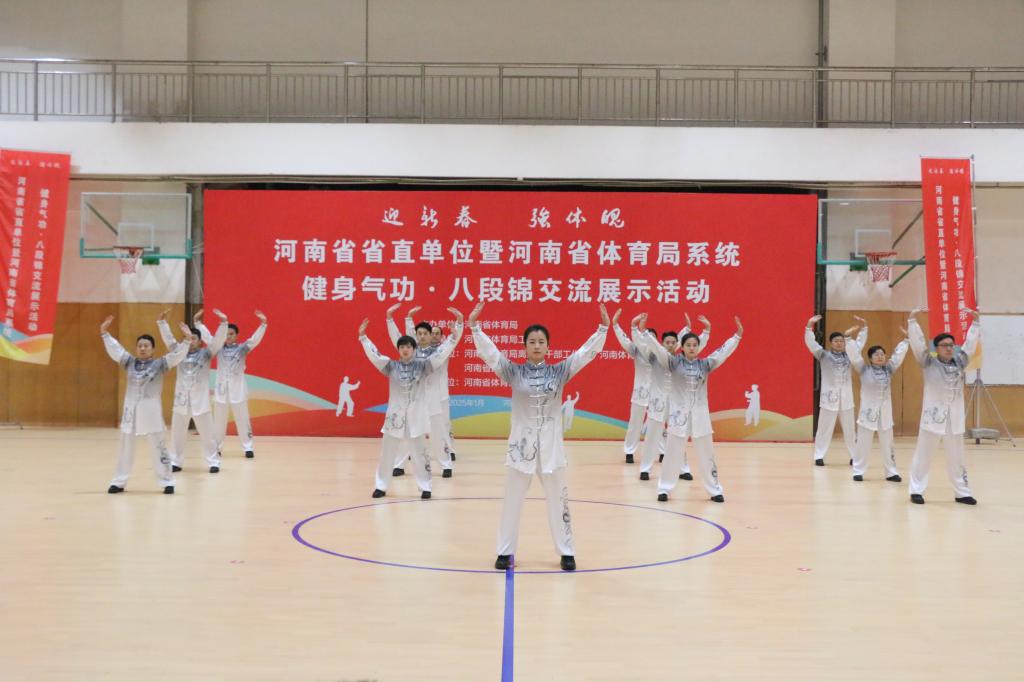2025年1月21日上午,“迎新春 强体魄”河南省省直单位暨河南省体育局系统健身气功·八段锦交流展示活动在我校综合训练馆火热举行,来自7家省直单位和省体育局系统14个单位的近400名选手参加。我校代表队由校领导郑焕民带队和我系教师组成。