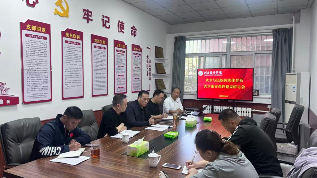 2025年9月24日上午,武术与民族传统体育系召开武术康养课程建设研讨会,聚焦专业课程体系优化,为培养高素质武术康养人才夯实基础。系主任胡玉玺主持会议,系党总支书记郭玉江、系党总支副书记杨应威、系副主任耿彬、系专职组织员袁晋文出席,会议还特别邀请体育教育系康复领域专家胡精超博士、禹洋老师参会指导。