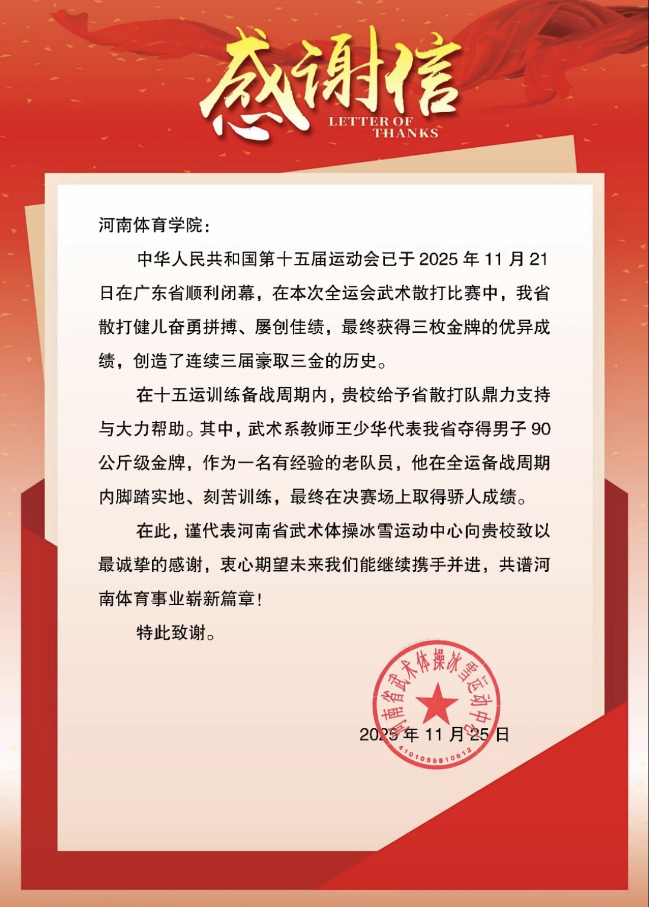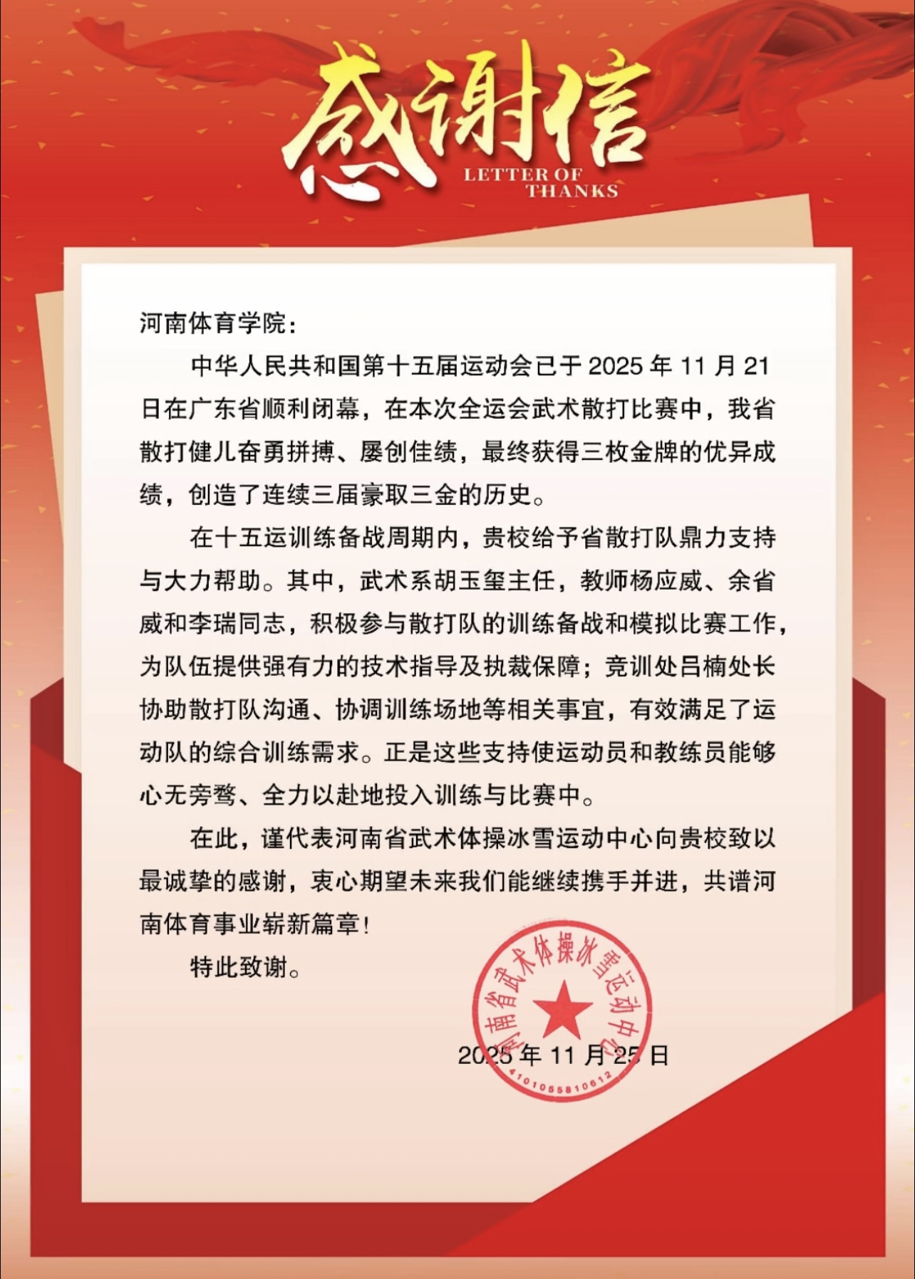 11月25日,我校收到河南省武术体操冰雪运动中心发来的感谢信,对我校助力省散打队在第十五届全国运动会中斩获3枚金牌、实现全运三连冠表示诚挚感谢。