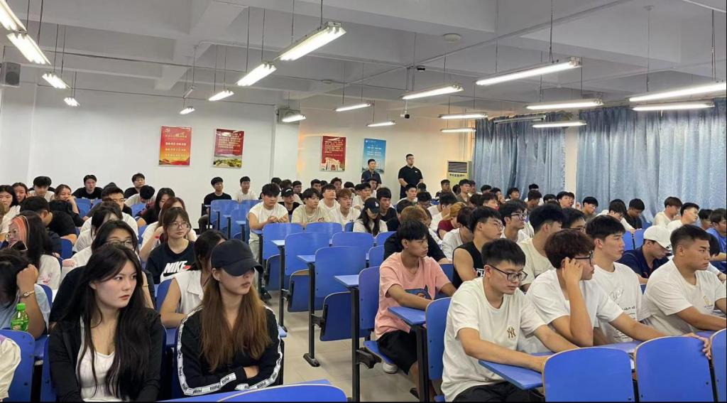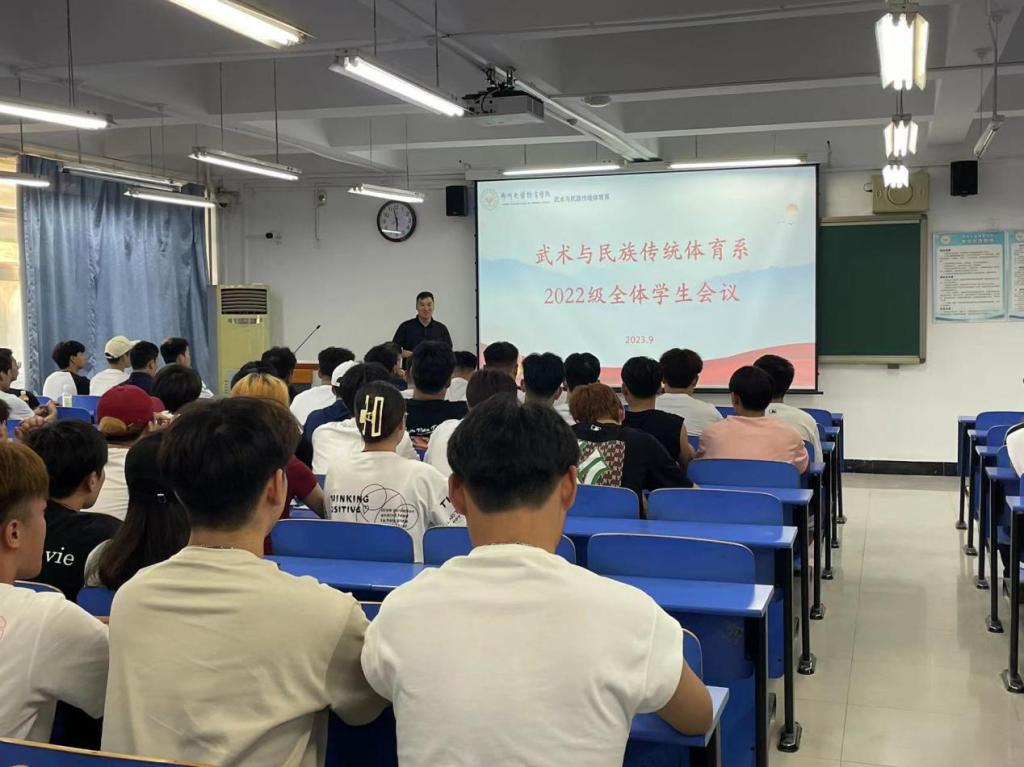 青春逢盛世,奋斗正当时。为了确保新学期学生工作有序开展,进一步加强平安校园建设,增强全体学生安全意识,营造一个安全、文明、和谐的校园环境。2023年9月5下午,武术与民族传统体育系在综合楼开展新学期“开学第一课”暨安全教育主题会议,系党总支书记郭玉江、副书记杨应威、副主任候胜川、辅导员程甲齐及武术系全体学生参加会议。