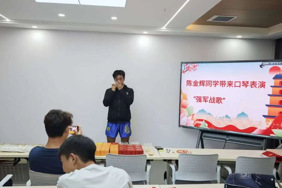 随后,陈金辉同学用口琴演奏《强军战歌》,口琴的音色清脆明亮,与这首歌曲的旋律相得益彰,增强了节奏感和力量感。