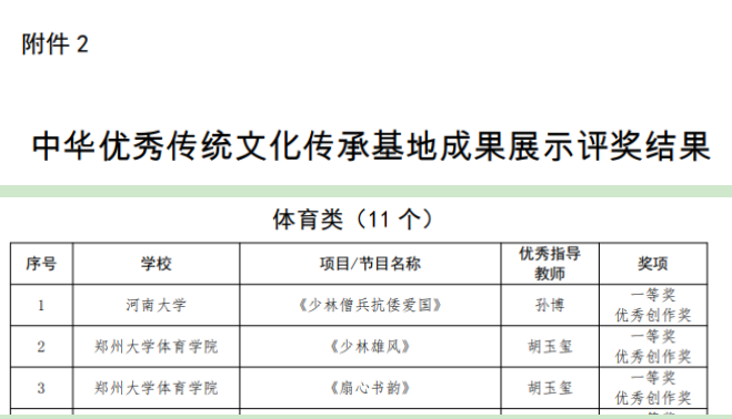 根据河南省教育厅《关于举办全省首届中小学生戏曲展演活动的通知》(教办体卫艺[2022]578号)和《关于举办中华优秀传统文化传承基地成果展示的通知》(教办体卫艺[2022]503号)的安排,2023年5月22-26日,河南省体育艺术传承项目展示周在河南大学成功举办,展示周包括首届中小学生戏曲展演和全省高校中华优秀传统文化传承基地成果展示两项内容,经过现场展演和展示以及专家组评审,我系的《少林雄风》和《扇心书韵》两个节目获得中华优秀传统文化基地成果展示一等奖和优秀创作奖,胡玉玺教授获得优秀指导教师称号。