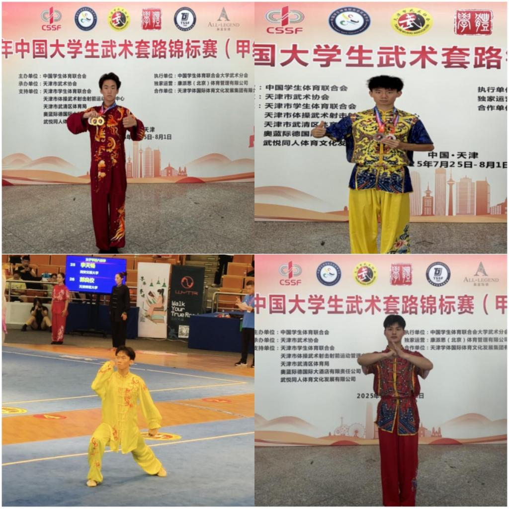 2024级武术2班崔硕,获男子甲组主动健康养生功法——蛇拳经络功、灵猿健养功两项第一名、获白露传统养生功第二名;2024级武术1班李金生,获男子甲组指定唐手拳第二名、男子甲组剑术第三名;2024级武术2班李子鹏,获男子甲组南少林易筋经第七名;2023级武术专选1班赵乐天,获体育道德风尚奖运动员。