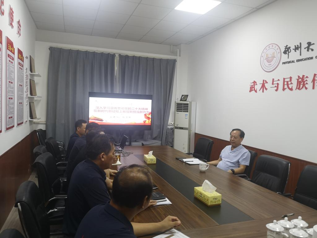 刘院长讲述了:党的二十大报告提出要“加快建设体育强国”,明确了体育强国建设的方法和路径,为我们开展体育工作指明了方向。在新时代、新征程上,我们必须系统完整全面深入地学习贯彻落实习近平新时代中国特色社会主义思想、充分认识当代马克思主义及其世界观方法论在指导岗位实践推动工作中的意义和作用,在业务工作、学院转设上有新担当、新作为。