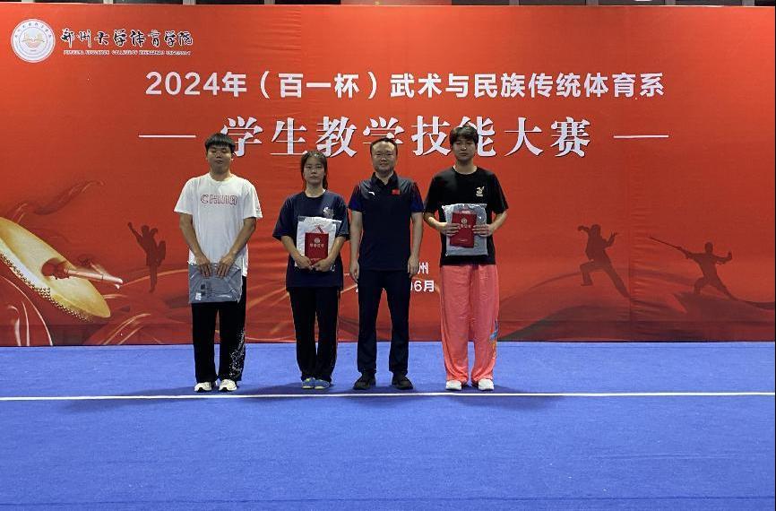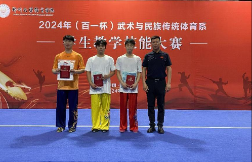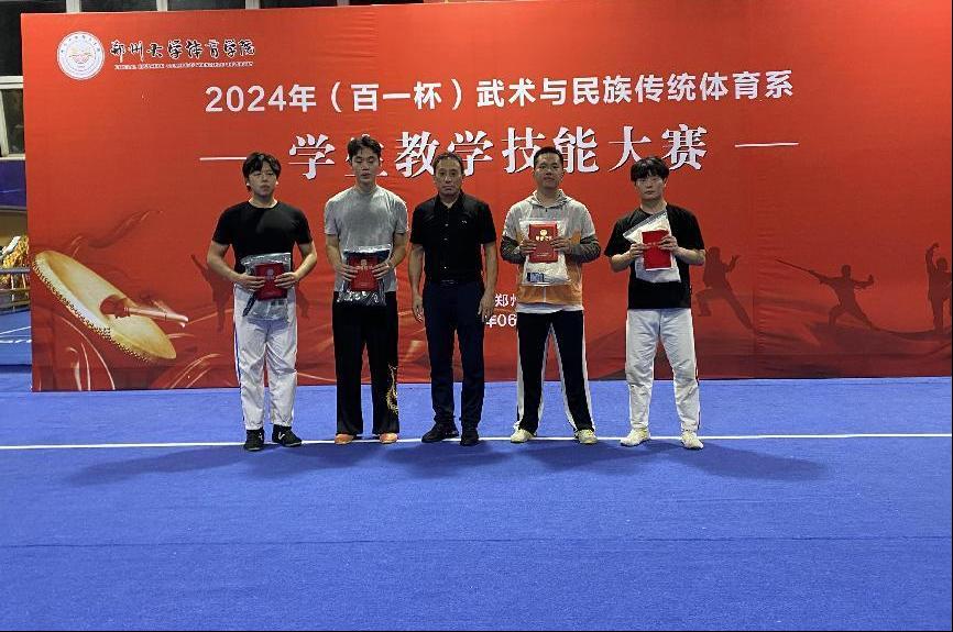 经过三日预赛的激烈角逐,决赛于6月20日在武术馆拉开帷幕,预赛中个人综合成绩排名前十的学生进入决赛,进行个人专项、副项2个项目的技能展示评比,参赛学生精湛的专业技能得到现场观众的阵阵喝彩与欢呼;最终根据综合成绩评定:朱吾长、张新豹、白帅彬荣获一等奖,张雨恒、孙灏、董金梅荣获二等奖,付瑜、竹天乐、马耀杰、刘家瑞荣获三等奖;赛后,学院教务处处长阎彬、系书记郭玉江、主任胡玉玺、学院人事处副处长张建丰分别为获奖学生颁奖并合影留念,至此,我系为期4天的学生教学技能大赛圆满落幕。