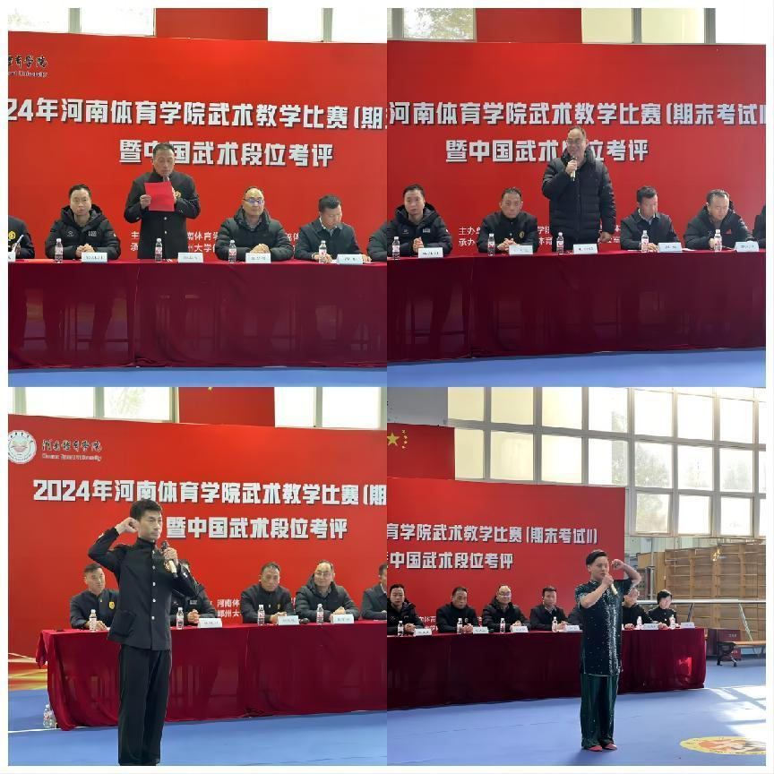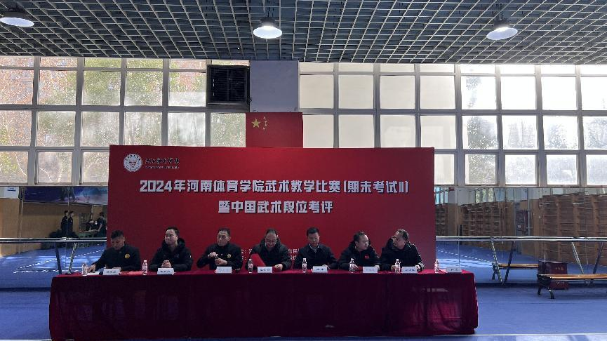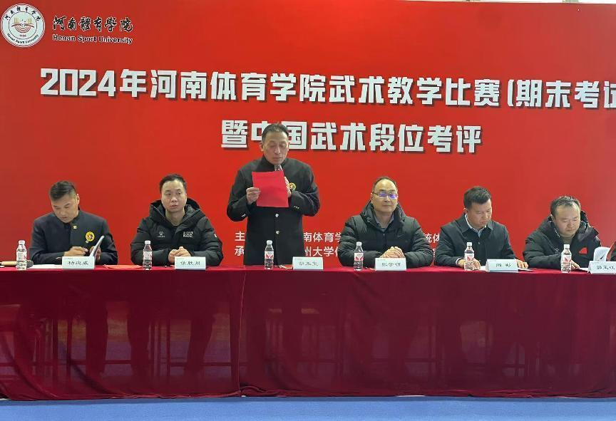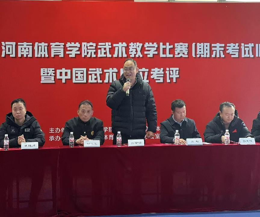 12月30日,河南体育学院武术教学比赛(期末考试Ⅱ)暨《中国武术段位》考评开幕式在我校武术馆隆重举行,标志着为期数日的武术技能展示与交流的盛会正式拉开帷幕。此次活动不仅是对本学期武术教学成果的一次全面检验,更是对传统武术文化的一次深情致敬与传承发扬。校领导张学领、教务处处长阎彬、武术系党总支书记郭玉江、武术系主任胡玉玺、河南省体育科学研究所所长侯胜川、人事处副处长张建丰、总裁判长肖宏出席开幕式,会议由武术系党总支副书记杨应威主持。