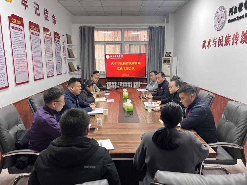 会上,胡主任围绕九项核心工作作出部署:一是推进全年工作自查,凝实我系2025年度特色工作、创新工作成果;二是明确11月25日启动我系2025年度优秀教师示范课观摩活动;三是计划召开我系2025年度运队训练比赛工作教练员总结会;四是细化人才培养方案大纲,明确课程团队,推进教材选择、行业导师选聘等;五是积极谋划期末考试与段位制考核嫁接;六是要求各教研室提前规划教学用品、训练器材采购,为新学期做好准备;七是启动2026年校内预算项目规划,围绕课程、师资、教学改革等推进多部门融合创新;八是部署明年单招宣传引导;九是谋划召开武术与民族传统体育专业发展特色座谈会。