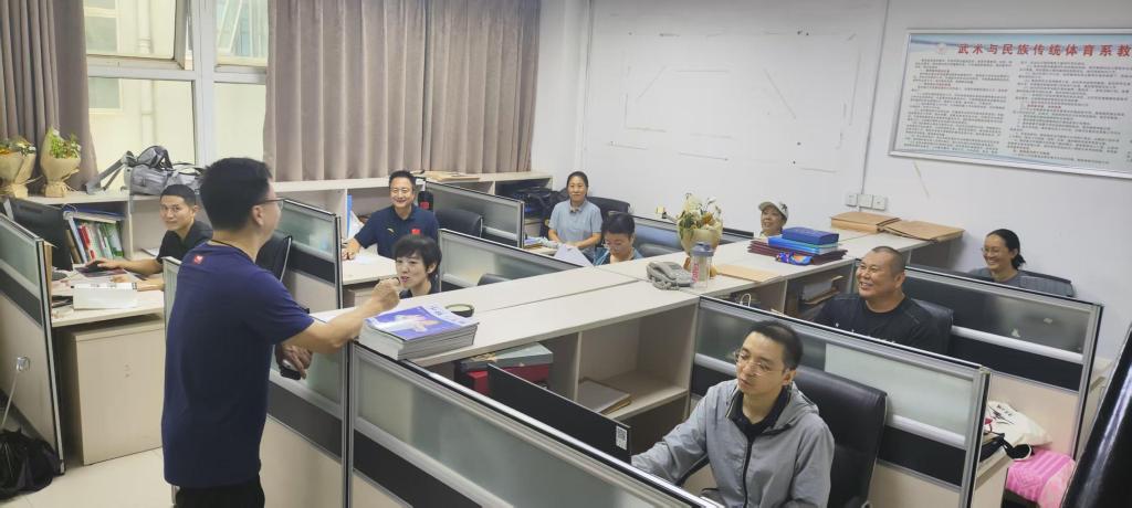 2025 年 9 月 16 日,武术套路教研室召开本学期首次教学工作例会。教研室主任陈钢主持会议。会议伊始,陈钢主任系统总结了开学首周教学运行情况。他指出,全体教师严格落实教学规范,教学工作稳步进行。教研室经讨论后认为,应当加强郑州校本部武术馆日常清洁管理,规范调课审批流程。针对第三周登封校区教学工作,陈钢主任强调,必须严格执行武术馆着装规范,要求教师督促学生更换武术鞋或脱鞋入场。