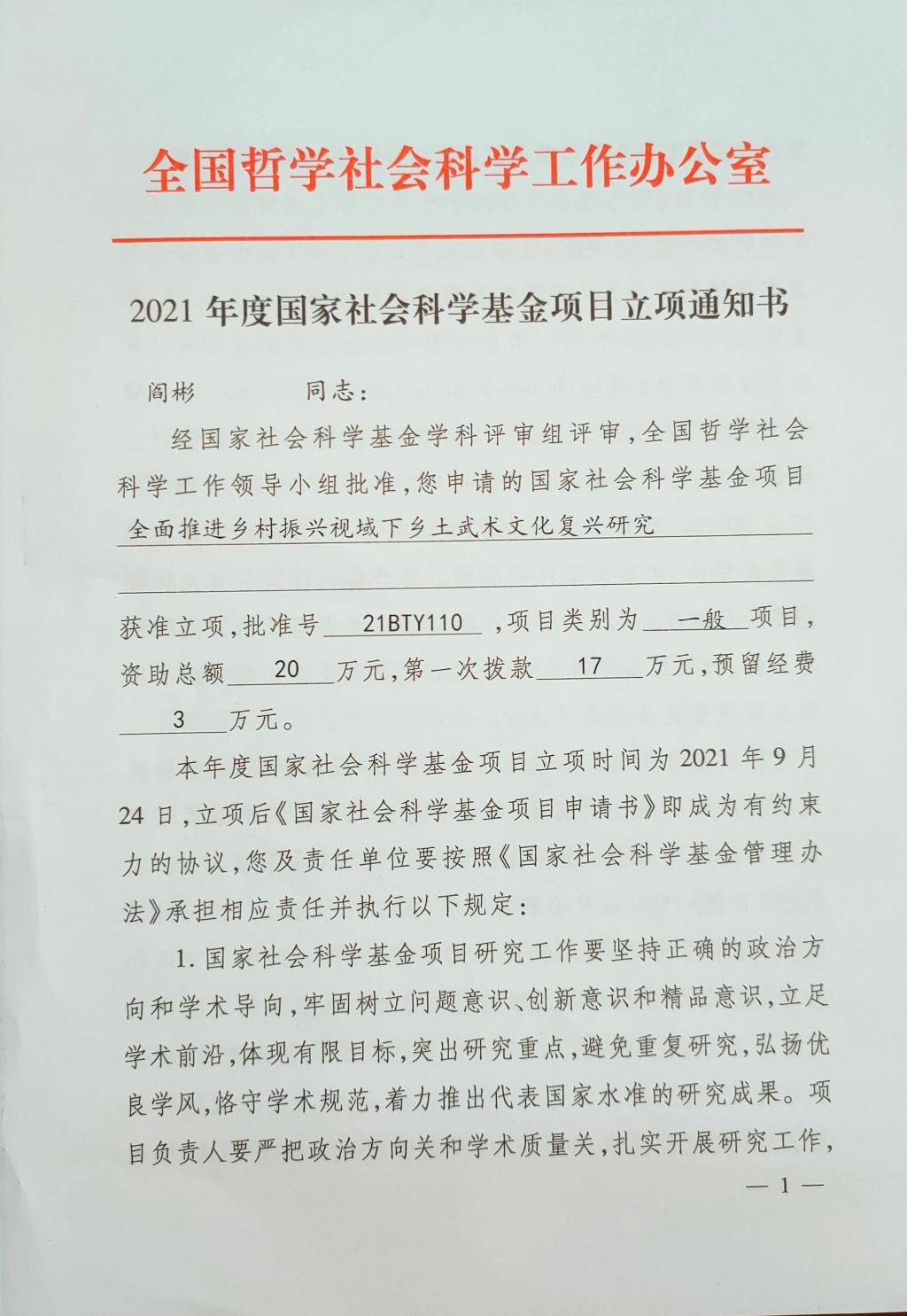 日前,全国哲学社会科学工作办公室批准了2021年度国家社科基金立项项目,我系阎彬博士主持的《全面推进乡村振兴视域下乡土武术文化复兴研究》获批立项。