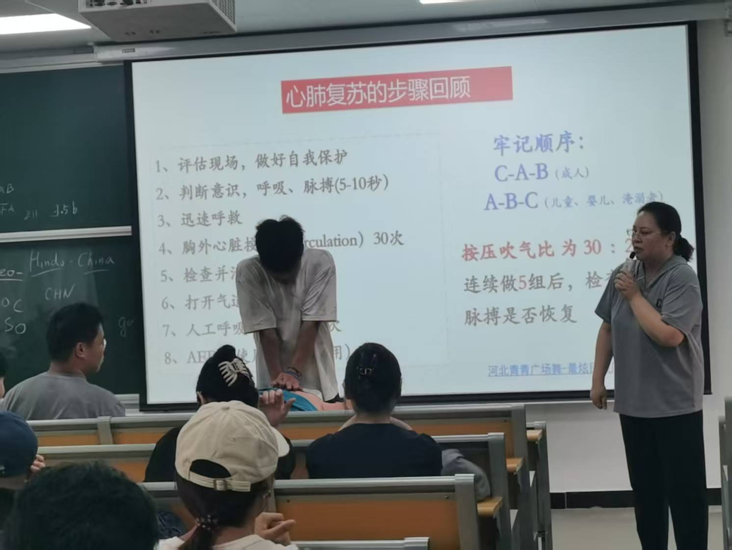 培训过程中,禹洋老师结合自身多年的急救实践经验,围绕运动性伤害的特点展开讲解。他首先通过真实案例引入,让学生们深刻认识到运动场景下及时、正确急救的重要性——在运动损伤发生后的“黄金急救时间”内,规范的急救操作能有效降低伤害程度,甚至挽救生命。随后,禹洋老师聚焦心肺复苏(CPR)技能,从判断患者意识、呼叫急救支援、胸外按压的姿势与力度、人工呼吸的操作要点,到自动体外除颤仪(AED)的使用流程,每一个步骤都进行了细致的理论讲解和标准的动作示范。为确保学生们真正掌握操作要领,禹洋老师还邀请学生上台利用模拟人进行实操演练,针对学生在按压深度、频率、呼吸配合等方面存在的问题,逐一进行纠正和指导,帮助学生精准把握操作细节。