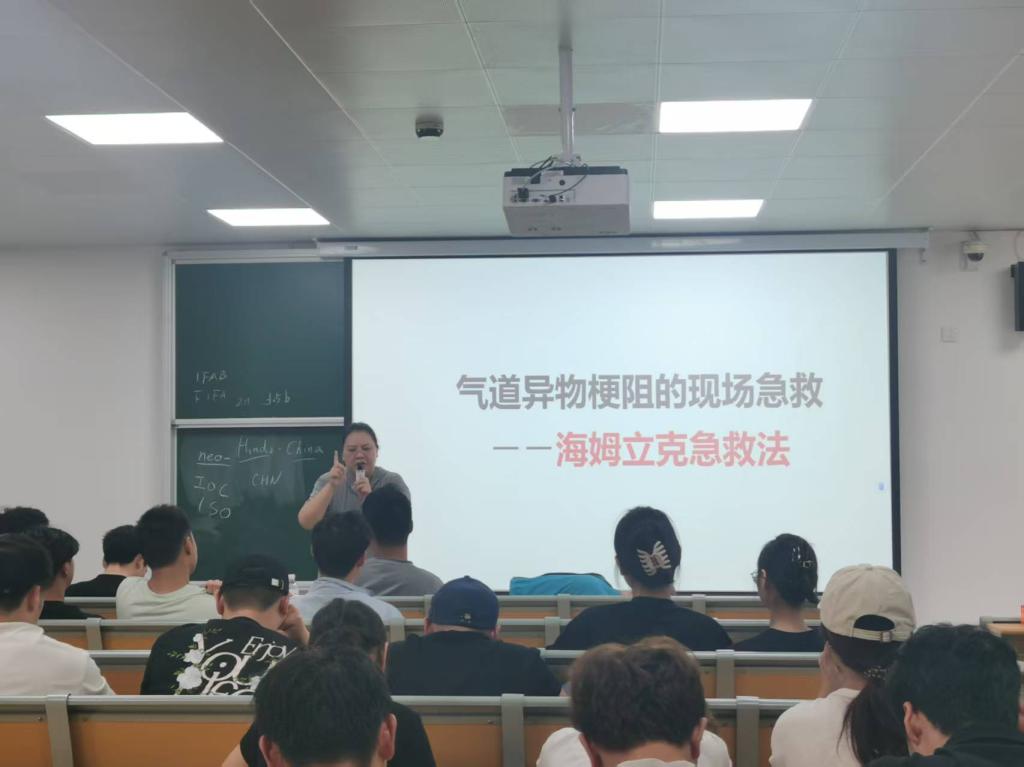 在海姆立克急救法教学环节,禹洋老师结合运动场景中常见的异物卡喉情况,详细讲解了成人、儿童及自我海姆立克急救法的适用场景与操作步骤。同时组织学生进行模拟练习,让每个人都有机会亲身体验急救过程,进一步强化操作记忆。