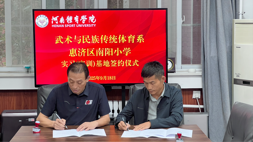 2025年9月18日,河南体育学院武术与民族传统体育系和惠济区南阳小学,正式签署协议共建实习(实训)基地。本次签约仪式由系党总支副书记杨应威负责主持,系主任胡玉玺、教师陈钢以及惠济区南阳小学的相关教师共同出席。